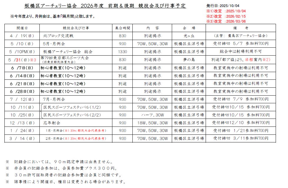 板橋区アーチェリー協会 2026年度 競技会及び行事予定